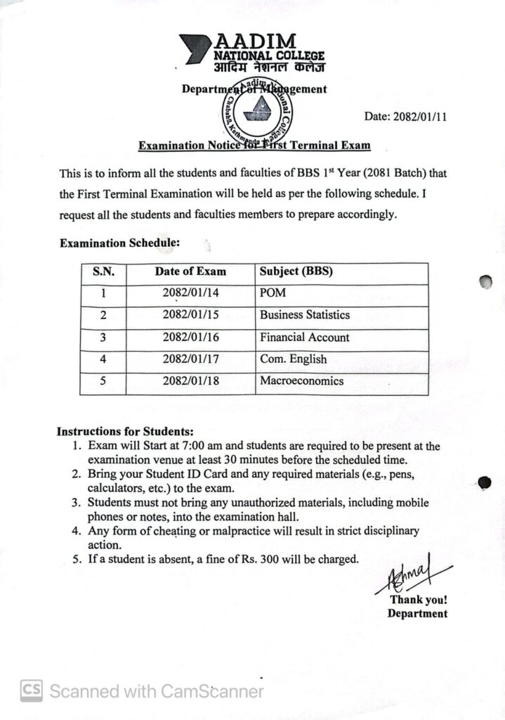 This to notify all the faculty and students of BBS 1st Year (2081 Batch) that your First Terminal Exam is going to held on 14th Baisakh, 2082. So, I request to prepare accordingly.